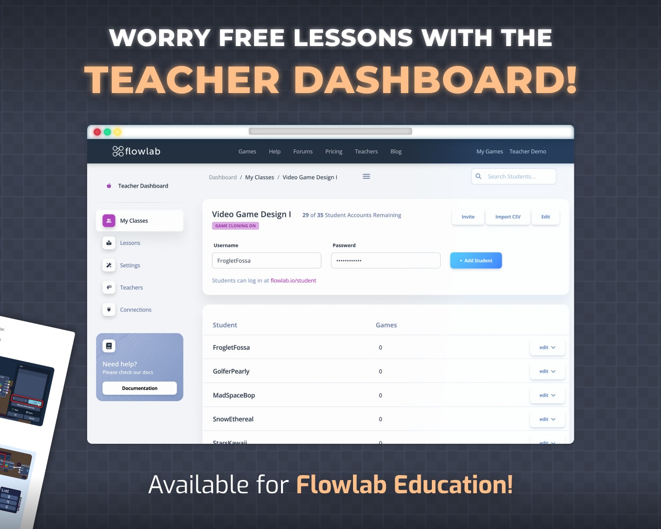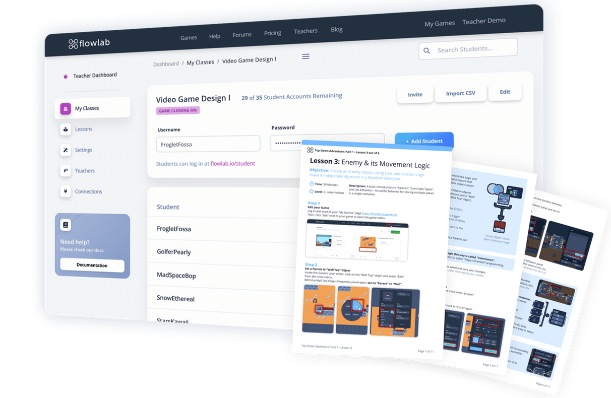 Flowlab's tools make it easy to get started with game development. You or your students don't need any prior programming experience