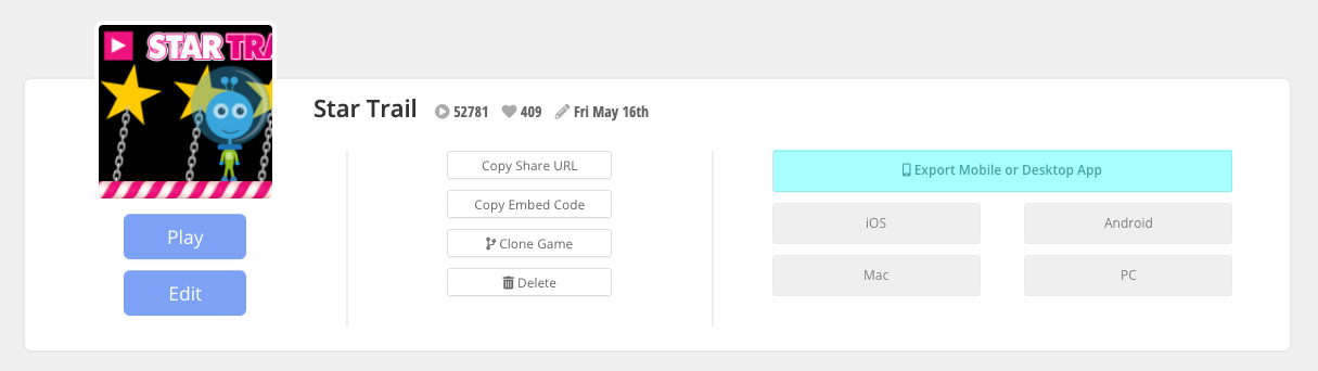 To begin exporting your game, go to My Games and click the Export Mobile or Desktop App